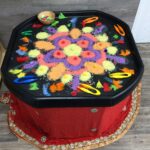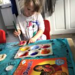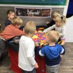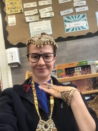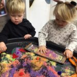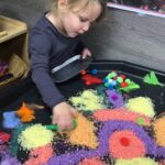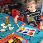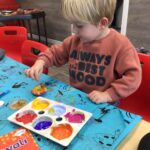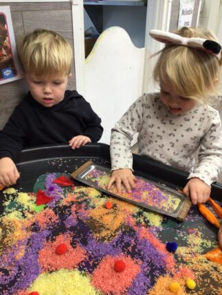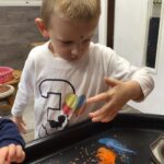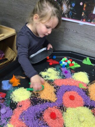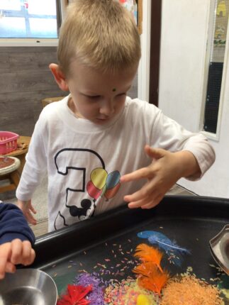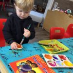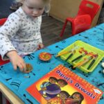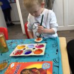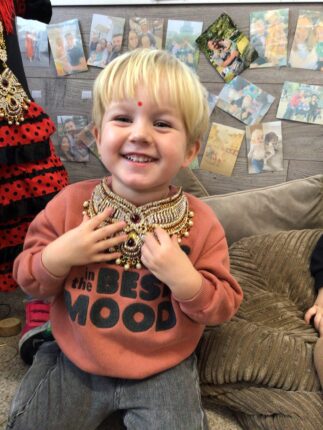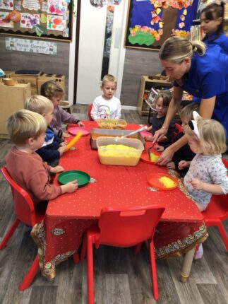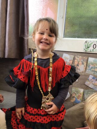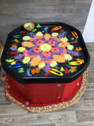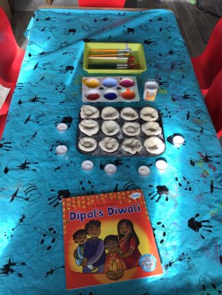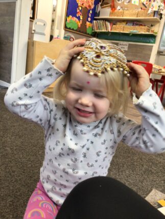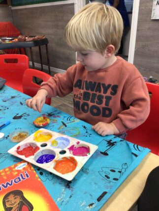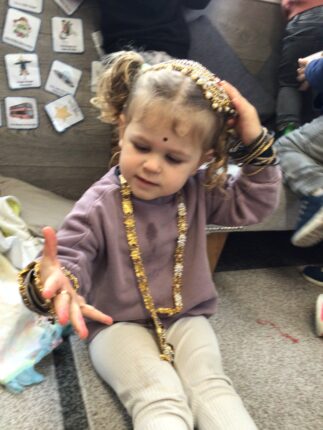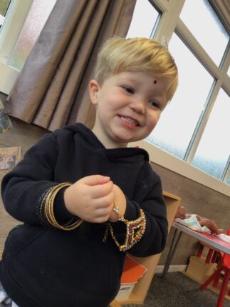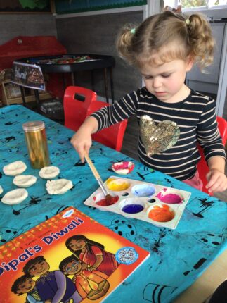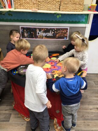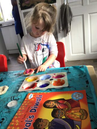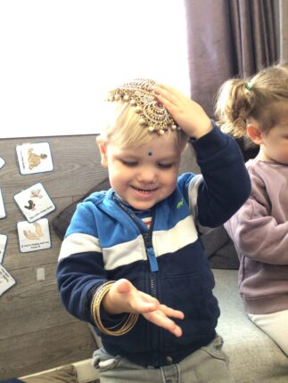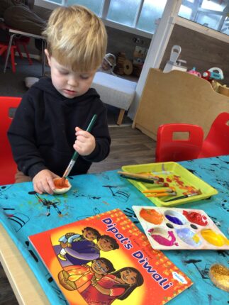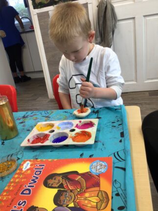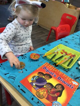 The toddlers have celebrated all things Diwali. We began by reading a book called Dipal’s Diwali which helped to explain how this religious celebration is cerebrated. The children explored a tuff tray filled with brightly coloured rice, pom poms and feathers and had a go at making some Rangoli patterns. We danced to Indian music with instruments and get dressed up in jewellery and a bindi. Sanita our cook cooked us a yummy curry for our lunch with India Music playing in the backroom. Finally we painted diya lamps using bright paints and glitter.
